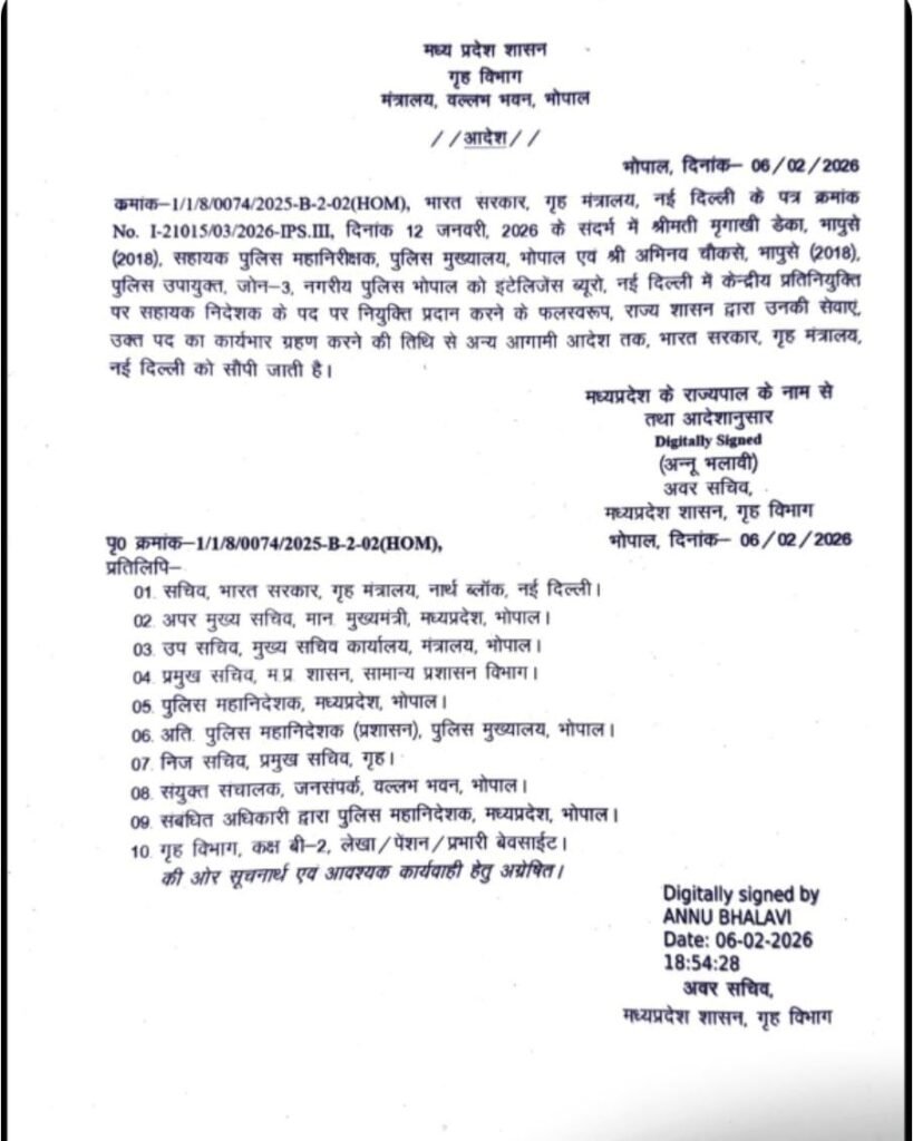 IPS Mriganki Deka Central Deputation : मध्य प्रदेश कैडर के दो चर्चित आईपीएस अधिकारी, मृगांकी डेका और अभिनव चौकसे, अब केंद्रीय प्रतिनियुक्ति (Central Deputation) पर अपनी सेवाएँ देंगे। राज्य शासन ने उन्हें कार्यमुक्त कर उनकी सेवाएँ केंद्रीय गृह मंत्रालय को सौंप दी हैं।