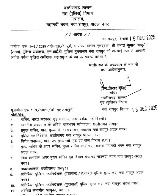 IPS Transfer : वहीं आईपीएस प्रभात कुमार को महासमुंद का नया पुलिस अधीक्षक बनाया गया है। इस संबंध में गृह विभाग, छत्तीसगढ़ शासन द्वारा आज आधिकारिक आदेश जारी किया गया।