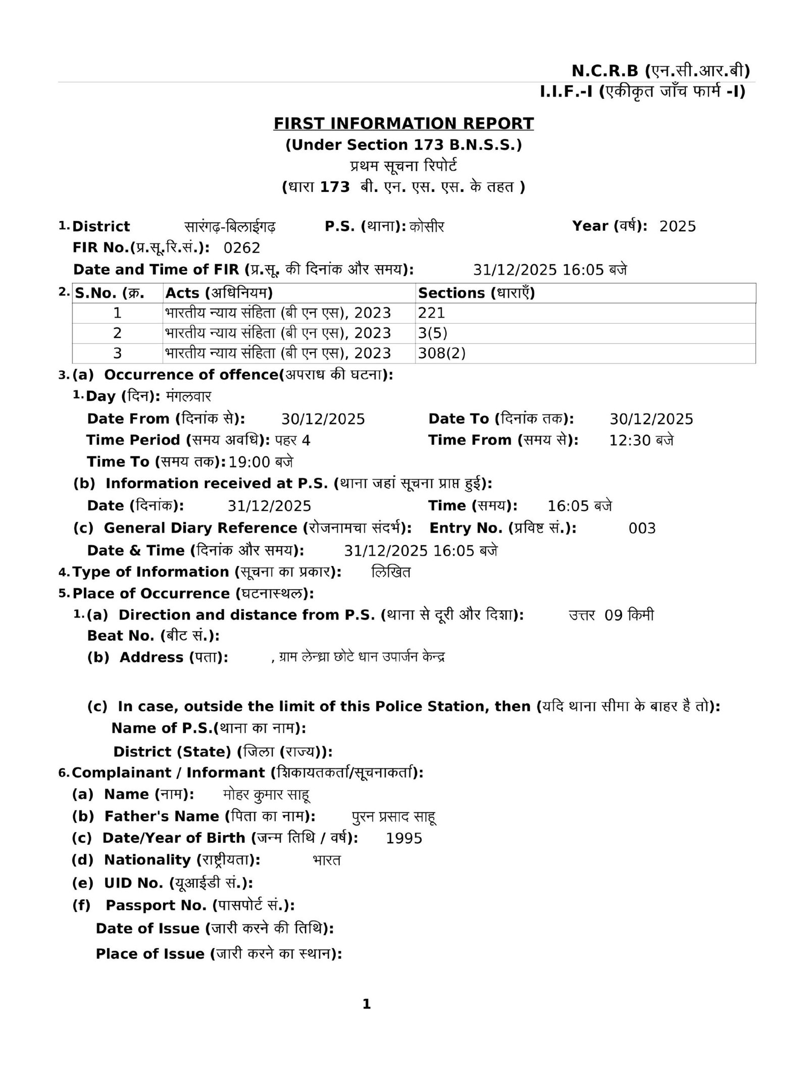 कोसीर पुलिस ने मामले की संवेदनशीलता को देखते हुए दोनों पक्षों पर भारतीय न्याय संहिता (BNS) के तहत क्रॉस एफआईआर (FIR) दर्ज की है: