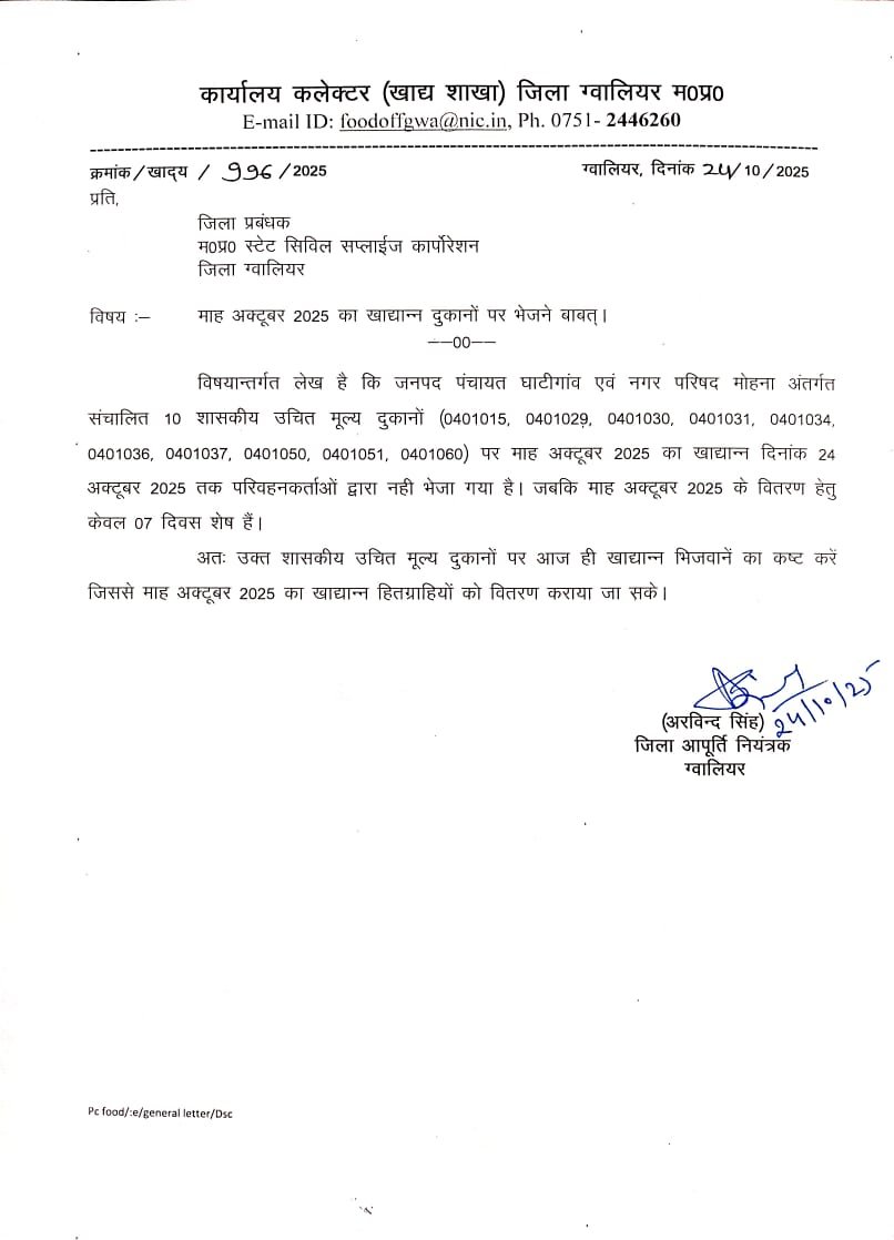 khaady vibhaag laparavahi : ग्वालियर। ग्वालियर जिले के घाटीगांव एवं मोहना क्षेत्रों में खाद्य विभाग की बड़ी लापरवाही का मामला सामने आया है। यहाँ संचालित दस शासकीय उचित मूल्य की दुकानों पर अभी तक खाद्यान्न (राशन) नहीं पहुँचा है, जिसके कारण हजारों हितग्राही परेशान हो रहे हैं।