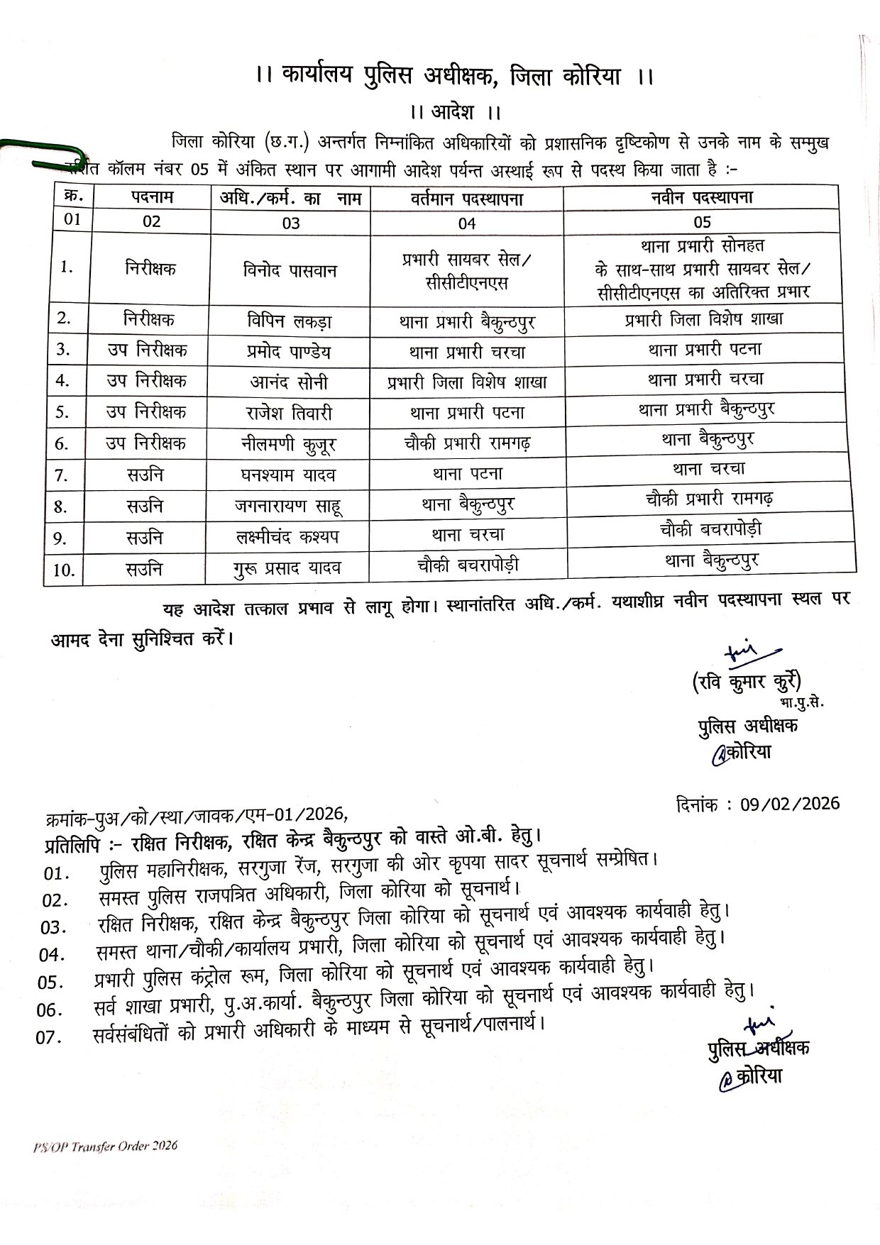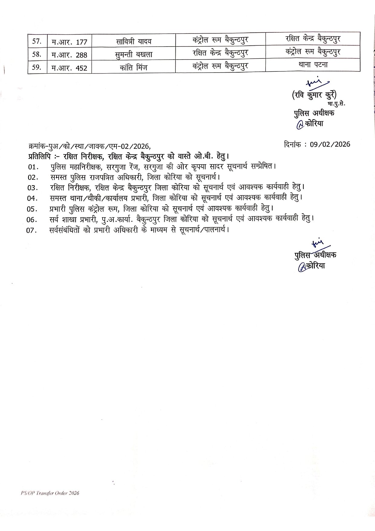 Korea Police Transfer List : बैकुंठपुर/कोरिया (09 फरवरी 2026): कोरिया जिले की कानून व्यवस्था को और अधिक प्रभावी और सुदृढ़ बनाने के लिए पुलिस अधीक्षक (SP) रवि कुमार कुर्रे (IPS) ने सोमवार को पुलिस विभाग में बड़ा प्रशासनिक फेरबदल किया है। जारी आदेश के तहत जिले के निरीक्षक, उप निरीक्षक, सहायक उप निरीक्षक और आरक्षकों सहित कुल 59 पुलिसकर्मियों का स्थानांतरण किया गया है। इस फेरबदल में जिले के कई महत्वपूर्ण थानों के प्रभारियों को इधर से उधर किया गया है।