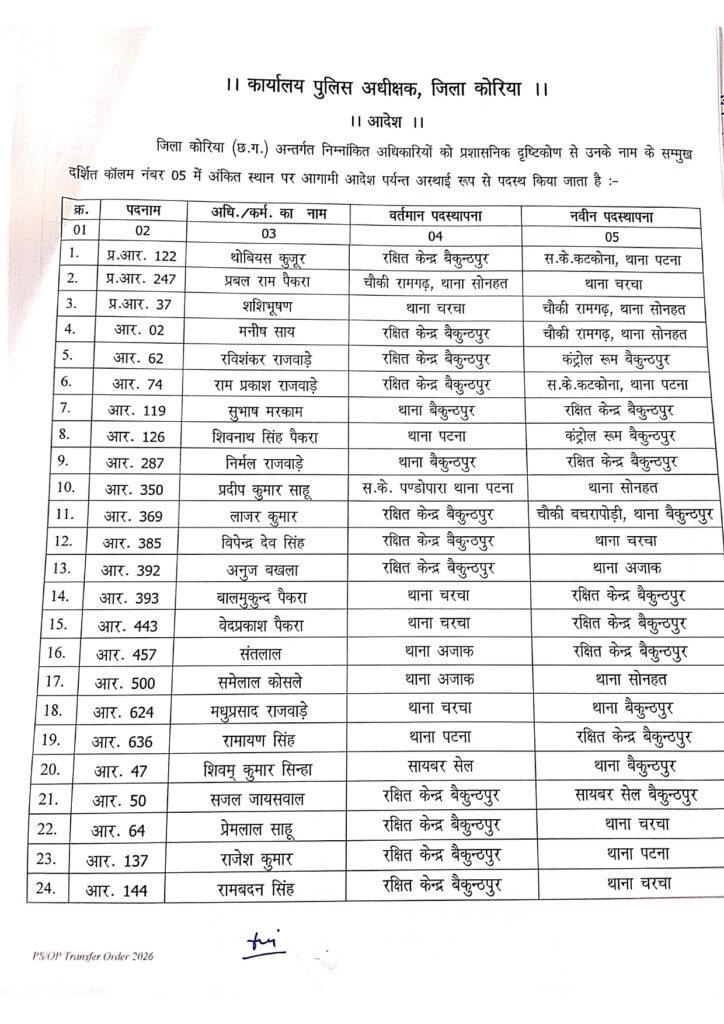 Korea Police Transfer List : कोरिया पुलिस विभाग में बड़ी सर्जरी: 59 पुलिसकर्मियों के तबादले, बैकुंठपुर और पटना समेत बदले कई टीआई
