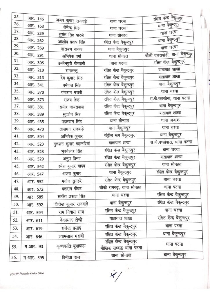 थाना प्रभारियों के अलावा बड़ी संख्या में प्रधान आरक्षक और आरक्षकों को रक्षित केंद्र (लाइन) से थानों और थानों से रक्षित केंद्र भेजा गया है। सूची में महिला आरक्षकों की तैनाती पर भी ध्यान दिया गया है, जिसमें कृष्णकांति कुशवाहा, विनीता राज और सावित्री यादव समेत अन्य को पटना, सोनहत और कंट्रोल रूम में पदस्थ किया गया है।