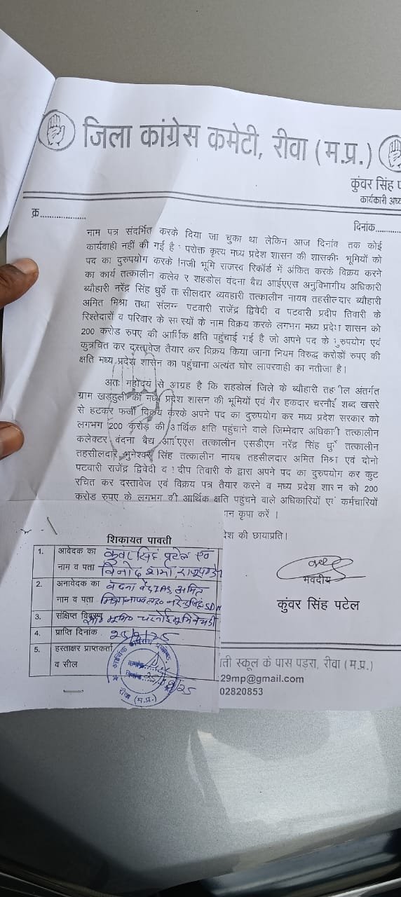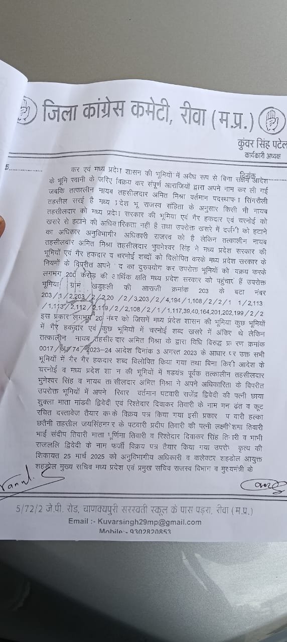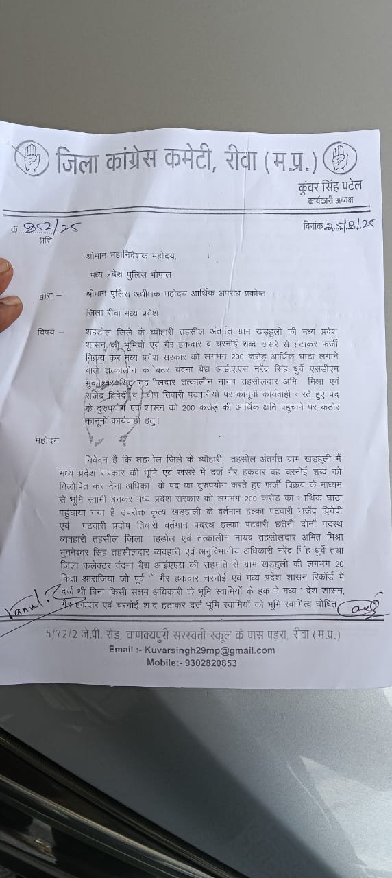 कांग्रेस नेता विनोद शर्मा और कुंवर सिंह ने बताया कि शहडोल जिले के ब्यौहारी ब्लॉक के खरौली गांव में मध्य प्रदेश शासन की लगभग 100 एकड़ चरनोई और गैर-हकदार जमीन की हेराफेरी की गई। आरोप है कि तहसीलदार और पटवारी ने इस जमीन को अपने परिजनों और रिश्तेदारों के नाम पर दर्ज कर दिया और बाद में इसे बेच दिया।