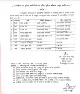 रायपुर। राजधानी रायपुर में पुलिस प्रशासन को और अधिक प्रभावी बनाने के उद्देश्य से पुलिस विभाग में बड़ा फेरबदल किया गया है। एसएसपी (सीनियर सुपरिटेंडेंट ऑफ पुलिस) डॉ. लाल उमेद सिंह ने देर शाम आदेश जारी करते हुए 9 थाना प्रभारियों (SHO) का तबादला कर दिया है। इस फेरबदल में रायपुर के कई महत्वपूर्ण और संवेदनशील थानों के मुखिया बदल दिए गए हैं, जिससे इन क्षेत्रों की कानून व्यवस्था और निगरानी में नई गति आने की उम्मीद है।