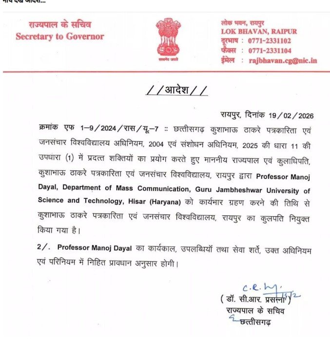 Manoj Dayal : जारी आदेश के अनुसार, छत्तीसगढ़ कुशाभाउ ठाकरे पत्रकारिता एवं जनसंचार विश्वविद्यालय अधिनियम, 2004 एवं संशोधन अधिनियम, 2025 की धारा 11(1) के तहत प्रदत्त शक्तियों का प्रयोग करते हुए राज्यपाल एवं कुलाधिपति द्वारा प्रो. मनोज दयाल को कार्यभार ग्रहण करने की तिथि से विश्वविद्यालय का कुलपति नियुक्त किया गया है।
