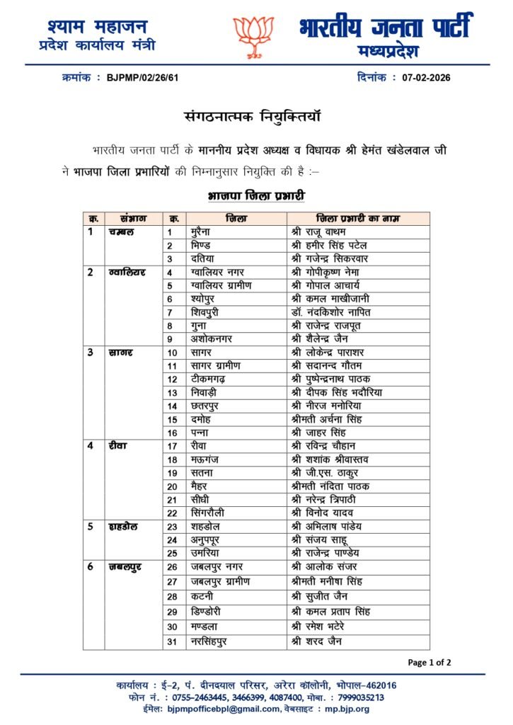 MP BJP District In-charge List 2026 : भोपाल (07 फरवरी 2026): मध्य प्रदेश बीजेपी ने सांगठनिक स्तर पर बड़ा फेरबदल करते हुए प्रदेश के सभी 62 संगठनात्मक जिलों के प्रभारियों की सूची जारी कर दी है। इस सूची में पार्टी के वरिष्ठ नेताओं और पूर्व सांसदों को प्राथमिकता देते हुए आगामी चुनावों और संगठन की मजबूती के लिए रणनीतिक तैनातियाँ की गई हैं।