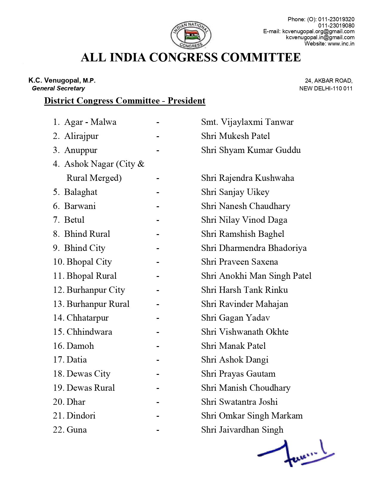 MP BREAKING : भोपाल : मध्यप्रदेश में कांग्रेस ने 71 जिलों के अध्यक्षों की घोषणा कर दी है। इसमें चिंटू चौकसे को इंदौर शहर, जबकि विपिन वानखेड़े को इंदौर ग्रामीण की कमान दी गई है। भोपाल शहर कांग्रेस के जिला अध्यक्ष प्रवीण सक्सेना, भोपाल ग्रामीण जिला अध्यक्ष अनोखी मानसिंह पटेल को रिपीट किया गया है।