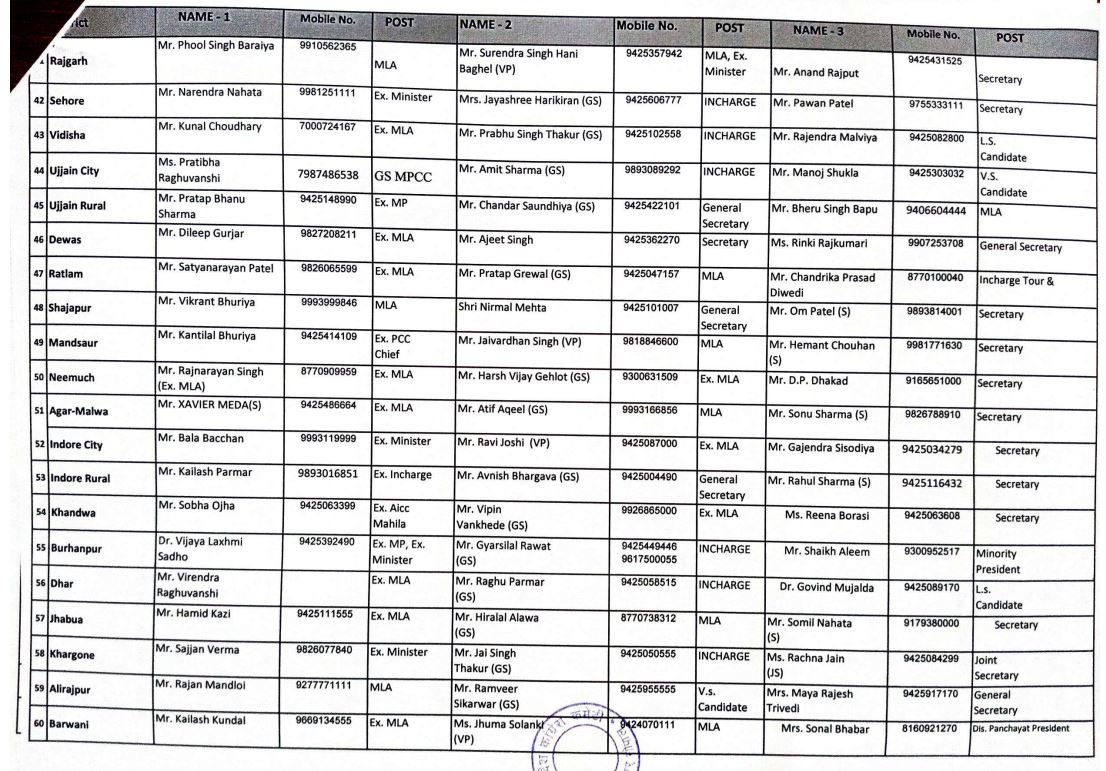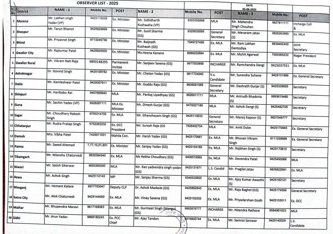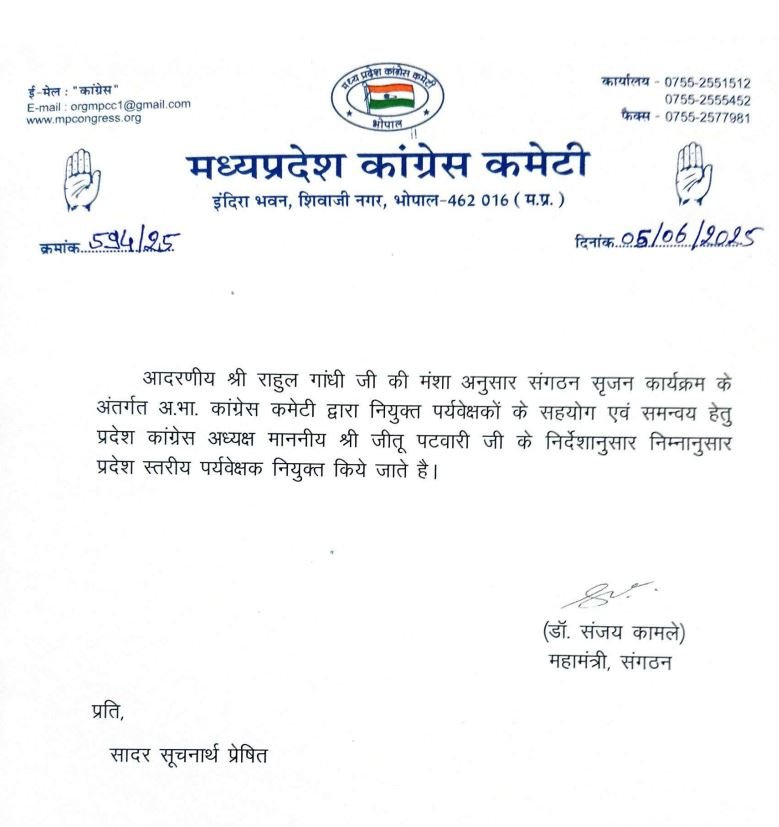 MP NEWS : भोपाल। अखिल भारतीय कांग्रेस कमेटी (AICC) के बाद अब मध्य प्रदेश कांग्रेस कमेटी (PCC) ने भी संगठन सृजन की प्रक्रिया को तेज कर दिया है। इस कवायद के तहत पार्टी के वरिष्ठ नेताओं को पीसीसी ऑब्जर्वर नियुक्त कर विभिन्न जिलों की जिम्मेदारी सौंपी गई है।