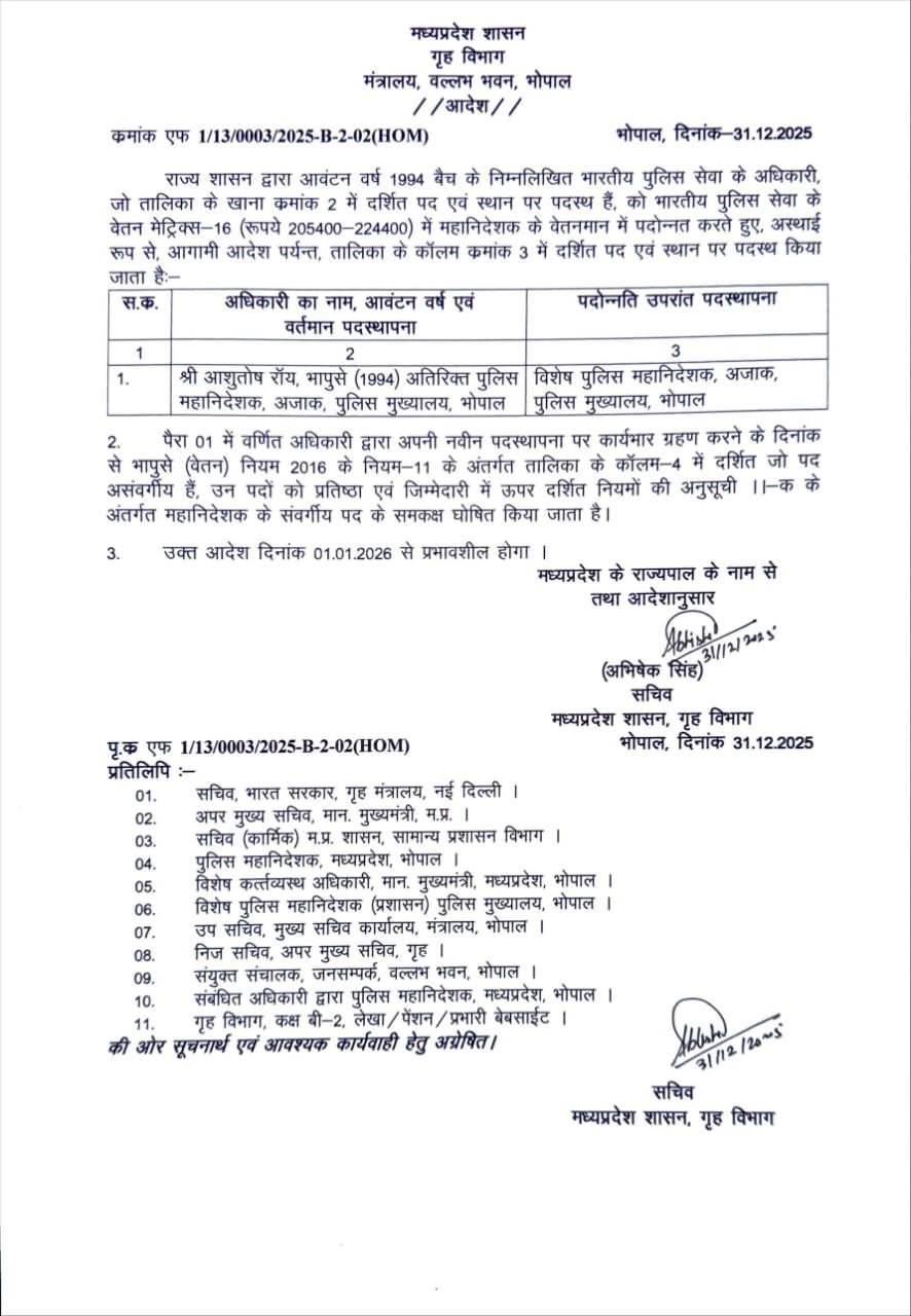 mp promotion : भोपाल: नए साल से पहले मध्य प्रदेश में कई आईपीएस अधिकारियों को पदोन्नति दी गई है। राज्य सरकार ने उच्च पदों पर प्रमोशन से जुड़ी सूची जारी की है। इसके तहत एडीजी आशुतोष रॉय को स्पेशल डीजी बनाया गया है। प्रमोद वर्मा को आईजी से प्रोमोट कर एडीजी पद पर पदोन्नत किया गया है।