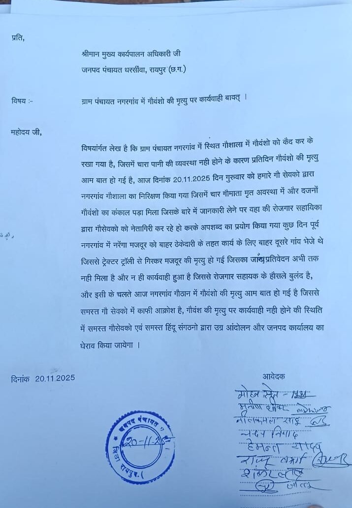 Gauthan negligence : धरसीवां : राजधानी रायपुर से सटे धरसीवां विकासखंड के ग्राम नगरगांव में सरकारी गौठान में उचित देखरेख के अभाव में कई गौवंश की मृत्यु होने का गंभीर मामला सामने आया है। इस घटना से स्थानीय गौसेवकों में भारी नाराजगी है, जिन्होंने गौठान प्रबंधन की लापरवाही के लिए जिम्मेदार लोगों पर उचित कार्रवाई की मांग की है।