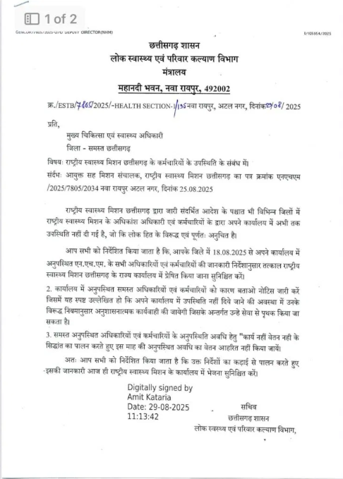 आदेश पत्र में स्पष्ट किया गया है कि आदेश के बाद भी अधिकांश जिलों में NHM अधिकारी-कर्मचारी कार्यालय नहीं पहुँच रहे हैं। यह लोकहित के खिलाफ और अनुचित है।
