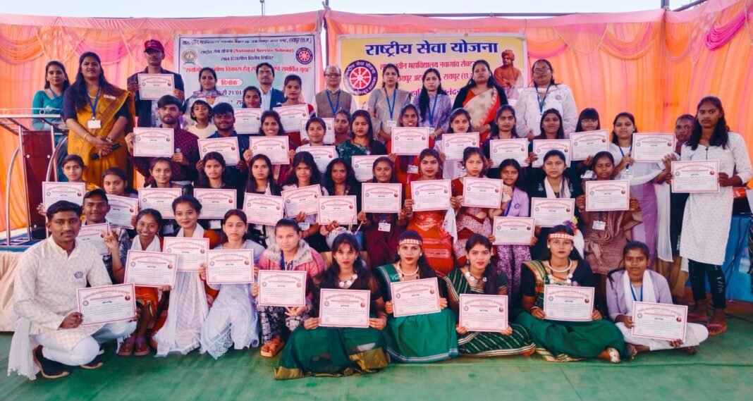 NSS Special Camp : नवा रायपुर। शासकीय नवीन महाविद्यालय नवागांव सेक्टर-28, अटल नगर द्वारा ग्राम राखी में आयोजित राष्ट्रीय सेवा योजना (NSS) के सात दिवसीय विशेष शिविर का बुधवार, 21 जनवरी 2026 को सफलतापूर्वक समापन हुआ। “सर्वांगीण विकास हेतु संकल्पित एवं समर्पित युवा” के ध्येय वाक्य के साथ आयोजित इस शिविर में 42 वर्तमान स्वयंसेवकों और 8 भूतपूर्व स्वयंसेवकों ने उत्साहपूर्वक भागीदारी की। समापन समारोह की शुरुआत मां सरस्वती और स्वामी विवेकानंद के तैलचित्र पर माल्यार्पण एवं दीप प्रज्वलन के साथ की गई।