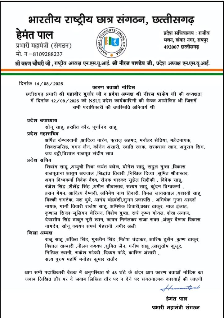 NSUI NEWS : रायपुर। भारतीय राष्ट्रीय छात्र संगठन (NSUI) छत्तीसगढ़ ने 12 अगस्त 2025 को हुई प्रदेश कार्यकारिणी बैठक में अनुपस्थित रहने वाले 84 पदाधिकारियों को कारण बताओ नोटिस जारी किया है। यह बैठक प्रदेश प्रभारी महावीर गुर्जर और प्रदेश अध्यक्ष नीरज पांडेय की अध्यक्षता में आयोजित हुई थी, जिसमें सभी पदाधिकारियों की उपस्थिति अनिवार्य थी। लेकिन कार्यक्रम के दौरान कई प्रदेश उपाध्यक्ष, महासचिव, सचिव और जिला अध्यक्ष नदारद रहे।