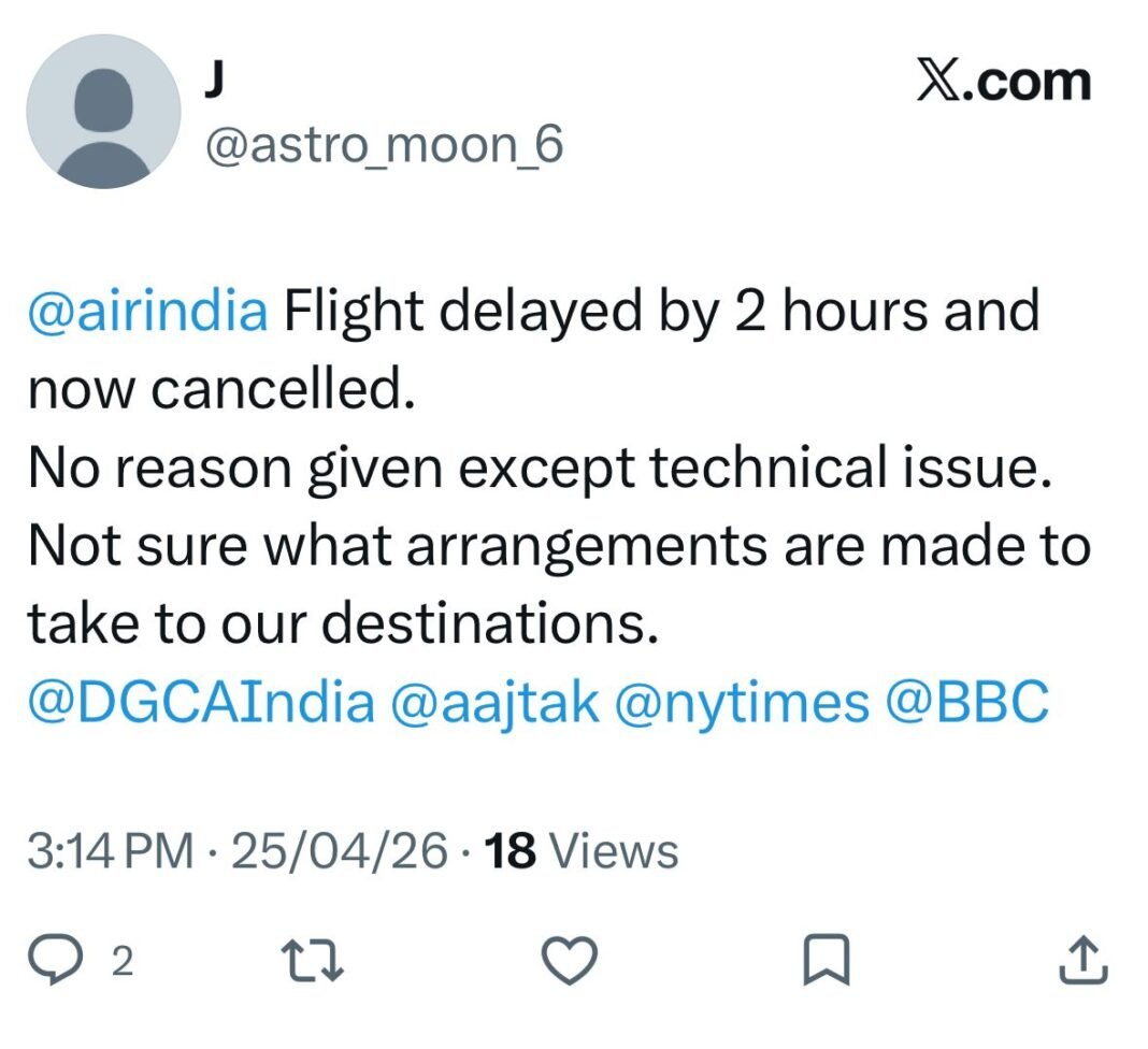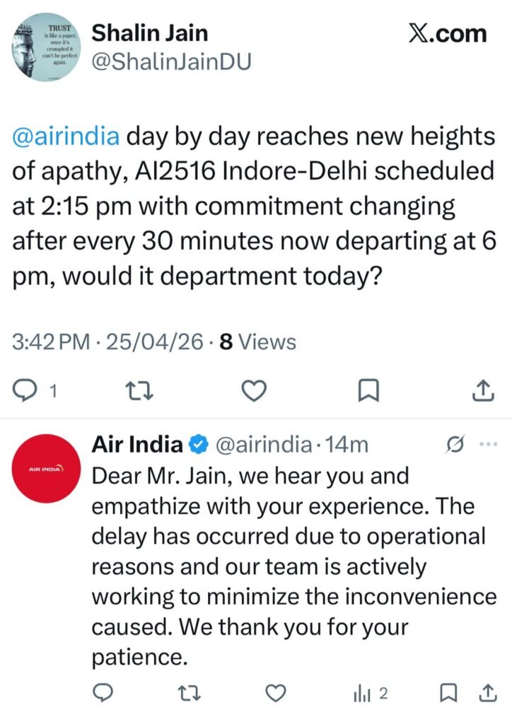 सोशल मीडिया पर एयरलाइन का जवाब: इस मामले में सोशल मीडिया प्लेटफॉर्म X (ट्विटर) पर एक यात्री द्वारा की गई शिकायत पर एयर इंडिया ने आधिकारिक प्रतिक्रिया दी है। एयरलाइन ने कहा, “हमें आपके अनुभव पर खेद है। ऑपरेशनल कारणों से देरी हुई है और हमारी टीम असुविधा को कम करने के लिए सक्रिय रूप से काम कर रही है।” हालांकि, एयरलाइन के इस औपचारिक जवाब से यात्रियों का गुस्सा शांत नहीं हुआ है। यात्रियों ने प्रबंधन पर खराब संचार और तकनीकी लापरवाही के गंभीर आरोप लगाए हैं।