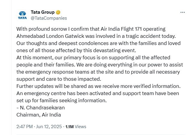 plane crash : हादसे के बाद एयर इंडिया और टाटा समूह की ओर से गहरा शोक व्यक्त किया गया है। एयर इंडिया के चेयरमैन एन. चंद्रशेखरन ने अपने बयान में कहा,यह अत्यंत दुखद घटना है। हमारी संवेदनाएं सभी पीड़ित परिवारों और उनके प्रियजनों के साथ हैं। हमारी पहली प्राथमिकता प्रभावित लोगों और उनके परिजनों को हर संभव सहायता पहुंचाना है। घटनास्थल पर मौजूद राहत दलों की हम हर तरह से मदद कर रहे हैं और सभी ज़रूरी संसाधन उपलब्ध करा रहे हैं। एयर इंडिया ने एक आपातकालीन केंद्र भी सक्रिय कर दिया है और यात्रियों के परिजनों को जानकारी देने के लिए विशेष सहायता टीम गठित की गई है।