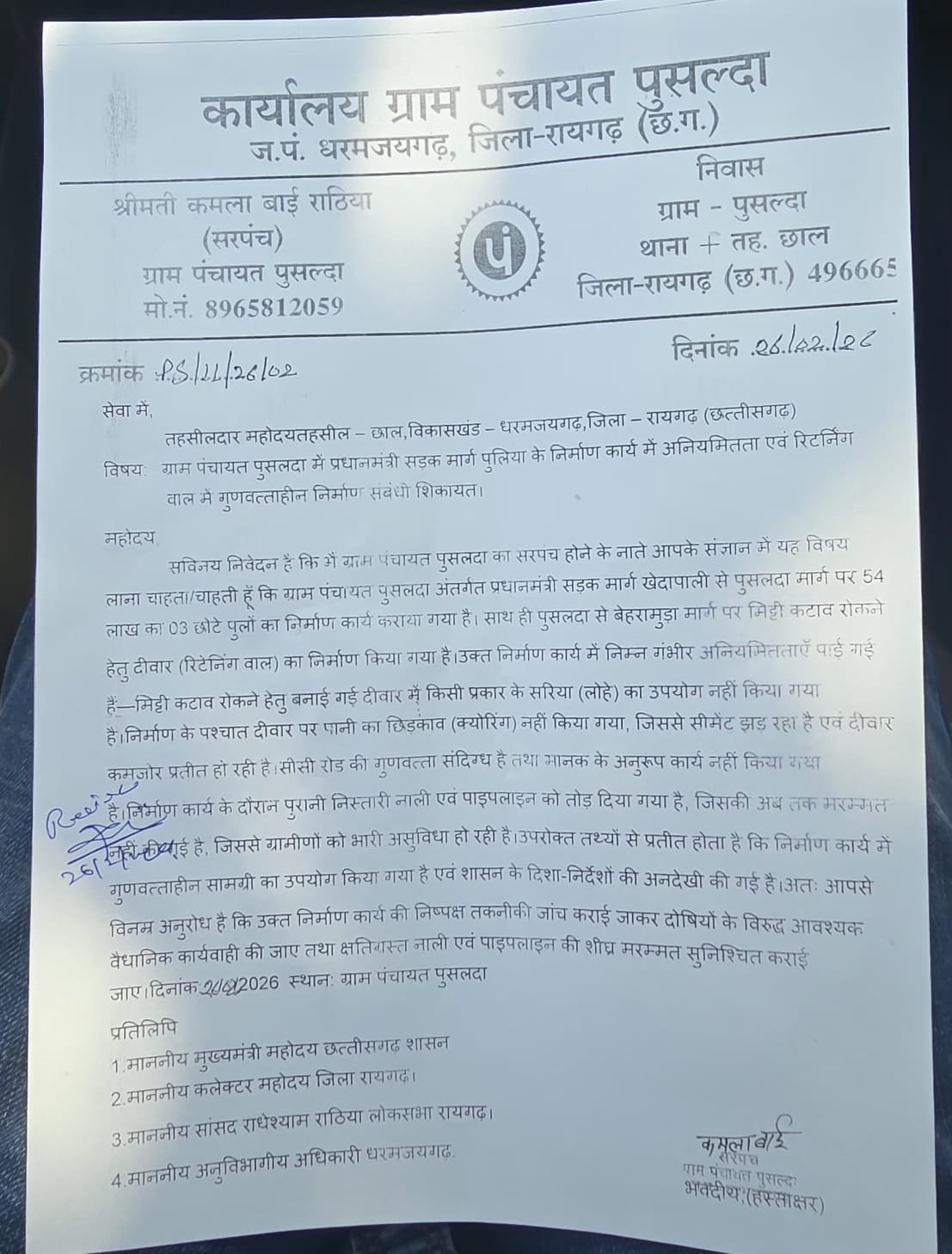 PMGSY Road Scam Raigarh : गौरी शंकर गुप्ता/रायगढ़/धरमजयगढ़ (26 फरवरी 2026): रायगढ़ जिले के धरमजयगढ़ विकासखंड अंतर्गत ग्राम पंचायत पुसलदा में प्रधानमंत्री ग्राम सड़क योजना के तहत चल रहे निर्माण कार्यों में भ्रष्टाचार का एक बड़ा मामला सामने आया है। सरपंच श्रीमती कमला बाई राठिया ने प्रशासन को पत्र लिखकर आरोप लगाया है कि ठेकेदार द्वारा गुणवत्ता को ताक पर रखकर जनता की जान जोखिम में डाली जा रही है।
