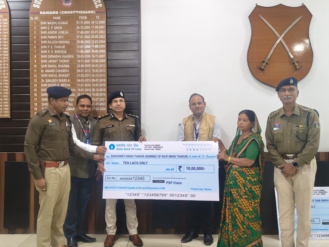 Raigarh Police Insurance Check : रायगढ़ (3 फरवरी 2026)। रायगढ़ जिला पुलिस बल ने ड्यूटी के दौरान आकस्मिक निधन का शिकार हुए अपने दो जांबाज साथियों के परिवारों की मदद के लिए हाथ बढ़ाया है। वरिष्ठ पुलिस अधीक्षक (SSP) शशि मोहन सिंह ने एसबीआई बैंक प्रबंधन के साथ मिलकर दो दिवंगत पुलिसकर्मियों की पत्नियों को 10-10 लाख रुपये की बीमा राशि के चेक प्रदान किए।