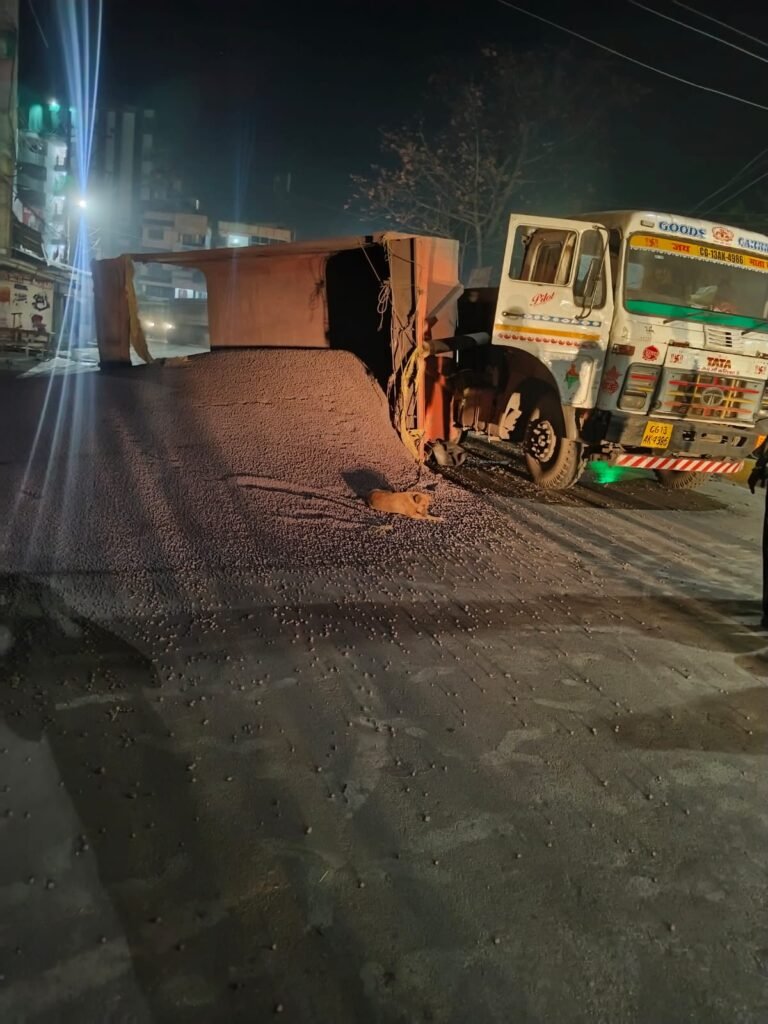 क्या है पूरा मामला? चक्रधरनगर थाना प्रभारी राकेश मिश्रा ने बताया कि ट्रेलर (CG 13 AK 4986) का चालक पुष्पराज साहू प्रतिबंधित क्षेत्र में खतरनाक तरीके से वाहन चला रहा था, जिसके चलते वाहन अनियंत्रित होकर पलट गया। ट्रेलर में 25 टन आयरन पेलेट (गोली) ओवरलोड थी। घटना के तुरंत बाद पुलिस की टीम ने मौके पर पहुंचकर जेसीबी की मदद से सड़क पर बिखरे आयरन पेलेट को हटवाया और यातायात बहाल किया। जांच में पाया गया कि ट्रेलर का बीमा भी नहीं था।