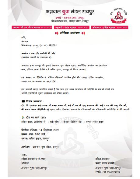 रायपुर: अग्रवाल सभा, रायपुर की इकाई अग्रवाल युवा मंडल द्वारा रविवार, 14 सितंबर 2025 को मरीन ड्राइव, तेलीबांधा में अग्रथन – एक दौड़ स्वदेशी की ओर का भव्य आयोजन किया जाएगा। इस दौड़ में 5000 से अधिक प्रतिभागी हिस्सा लेंगे और स्वास्थ्य, एकता तथा जागरूकता का संदेश देंगे।