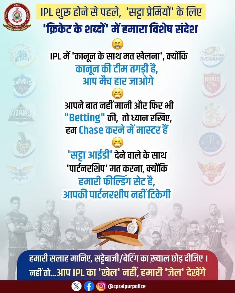 रायपुर पुलिस ने एक खास संदेश जारी करते हुए सट्टेबाजों को आगाह किया है। पुलिस ने क्रिकेट की भाषा का इस्तेमाल करते हुए कहा—“कानून के साथ मत खेलना, वरना मैच ही नहीं, जेल भी देखनी पड़ेगी।” इस संदेश के जरिए लोगों को सट्टेबाजी से दूर रहने की सलाह दी गई है।