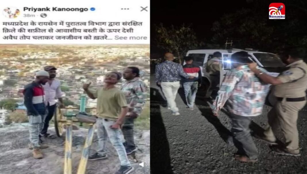 निशानेबाज न्यूज़ डेस्क: मध्यप्रदेश के रायसेन जिले में सोशल मीडिया पर वायरल हुए एक वीडियो को लेकर बड़ा विवाद खड़ा हो गया। इंस्टाग्राम पर पोस्ट की गई एक रील में रायसेन किले से तोप चलाते हुए धर्म विरोधी नारे लगाने का आरोप लगा है। इस मामले में पुलिस ने कार्रवाई करते हुए चार आरोपियों को गिरफ्तार कर लिया है
