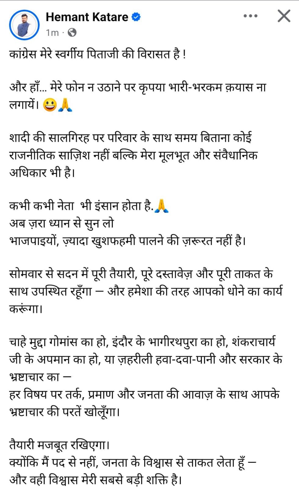 हेमंत कटारे का इस्तीफा और बीजेपी में आने की अटकलें हेमंत कटारे के इस्तीफे पर प्रतिक्रिया देते हुए रामेश्वर शर्मा ने कहा, “हेमंत ही जानें कि उन्होंने इस्तीफा क्यों दिया। हम कांग्रेस के अंदरूनी मामलों में नहीं घुसना चाहते। यह उनके मान का अपमान है या कोई और कारण, यह उनके नेता ही बेहतर बता पाएंगे।” जब उनसे पूछा गया कि क्या हेमंत कटारे भाजपा में शामिल होंगे, तो उन्होंने मुस्कुराते हुए कहा, “राजनीति में दरवाजे कभी बंद नहीं होते। हालांकि अभी हमारे पास कोई वैकेंसी नहीं है, लेकिन हम किसी को तोड़ने का प्रयास भी नहीं कर रहे। अगर कोई मोदी जी के काम को देखकर आना चाहता है, तो उसका स्वागत है।”