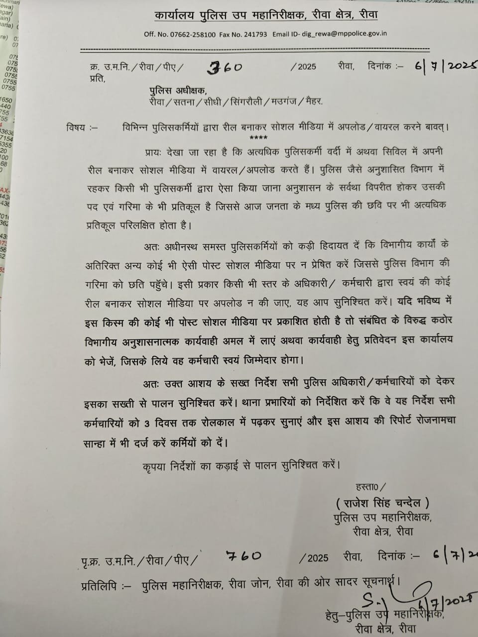 Reva News :रीवा। रीवा रेंज के डीआईजी ने एक अहम आदेश जारी करते हुए अपने अधीनस्थ पुलिसकर्मियों को वर्दी में या सिविल ड्रेस में सोशल मीडिया पर रील (Reel) बनाने से प्रतिबंधित कर दिया है।** यह निर्देश सभी जिलों के पुलिसकर्मियों पर समान रूप से लागू होगा।