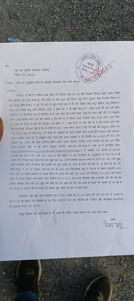 rewa news : पत्नी के साथ बिताए गए अंतरंग पलों का वीडियो वायरल, पति अब दे रहा जान से मारने की धमकी, पीड़िता पहुंची एसपी कार्यालय, एडिशनल एसपी बोले जल्द करेंगे गिरफ्तार