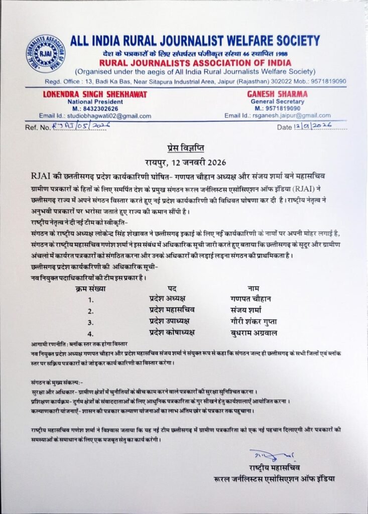 राष्ट्रीय नेतृत्व का फैसला: राष्ट्रीय अध्यक्ष लोकेंद्र सिंह शेखावत की स्वीकृति के बाद राष्ट्रीय महासचिव गणेश शर्मा ने आधिकारिक सूची जारी की। संगठन का मुख्य उद्देश्य छत्तीसगढ़ के सुदूर ग्रामीण अंचलों में चुनौतियों के बीच काम कर रहे पत्रकारों को एक मंच पर लाना और उनके अधिकारों के लिए आवाज उठाना है।