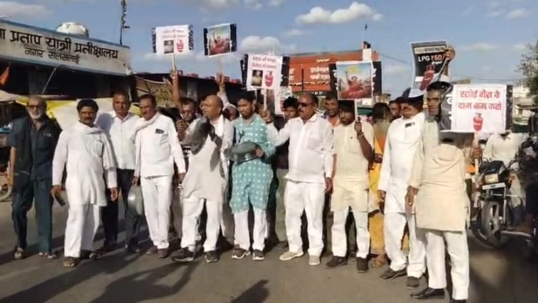 थाली-ताली जुलूस: हाथों में तख्तियां लिए कांग्रेस कार्यकर्ताओं ने पूरे सलसलाई में थाली बजाकर सरकार के खिलाफ नारेबाजी की।