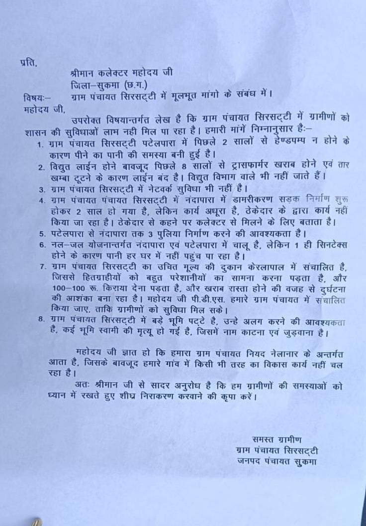 Sirsatti Gram Panchayat : सुकमा (कृष्णा नायक)। बस्तर संभाग के सुकमा जिले में विकास के दावों के बीच ग्राम पंचायत सिरसट्टी के ग्रामीणों ने बदहाली की एक दर्दनाक तस्वीर पेश की है। शनिवार को ग्रामीणों के एक प्रतिनिधिमंडल ने जिला कलेक्टर से मुलाकात कर बुनियादी सुविधाओं के अभाव को लेकर ज्ञापन सौंपा। ग्रामीणों का कहना है कि वे ‘नियद नेलानार’ (आपका अच्छा गांव) क्षेत्र के अंतर्गत आते हैं, फिर भी यहाँ विकास की किरण नहीं पहुँची है।
