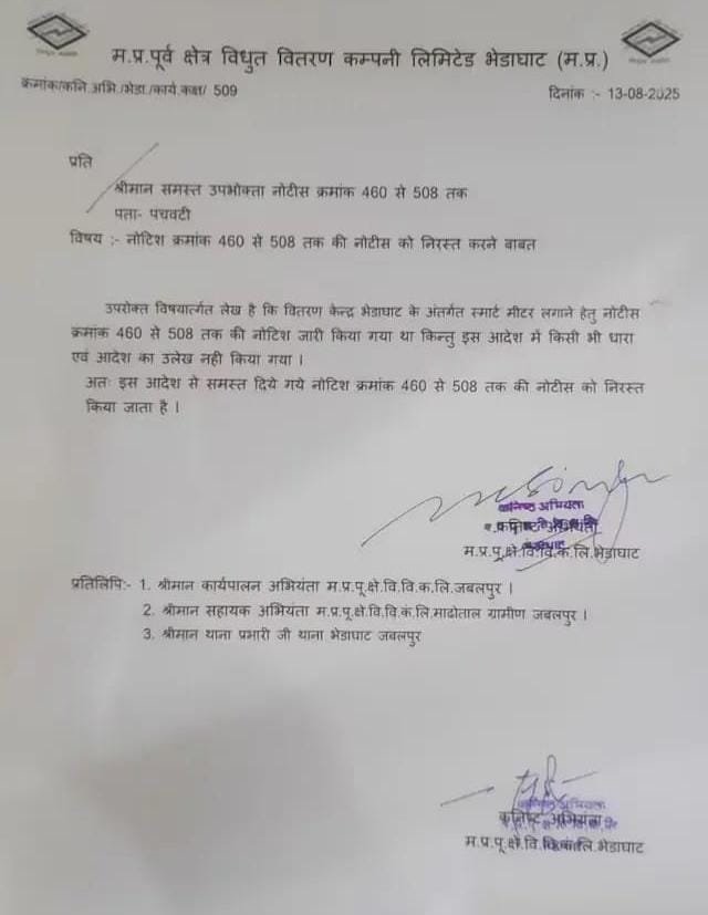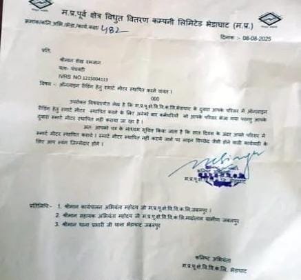 जबलपुर, संवाददाता – मध्य प्रदेश के भेड़ाघाट नगर पंचायत क्षेत्र में बिजली कंपनी ने 50 से अधिक परिवारों को स्मार्ट मीटर न लगवाने पर कनेक्शन काटने की धमकी भरे नोटिस भेजे। नोटिस में कहा गया कि यदि उपभोक्ता सात दिन में स्मार्ट मीटर लगवाने की स्वीकृति नहीं देंगे तो कनेक्शन काट दिया जाएगा।