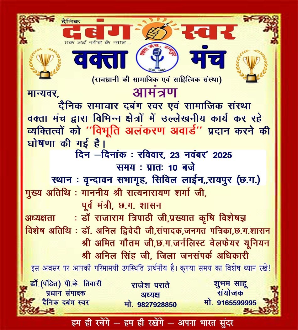 Vibhuti Award : रायपुर। प्रदेश की प्रतिष्ठित सामाजिक व साहित्यिक संस्था वक्ता मंच और दैनिक समाचार पत्र दबंग स्वर द्वारा विभूति अलंकरण समारोह का आयोजन रविवार, 23 नवंबर, प्रातः 10 बजे, वृन्दावन सभागृह, रायपुर में किया जाएगा। इस भव्य समारोह में प्रदेश की 121 विभूतियों का सम्मान किया जाएगा।