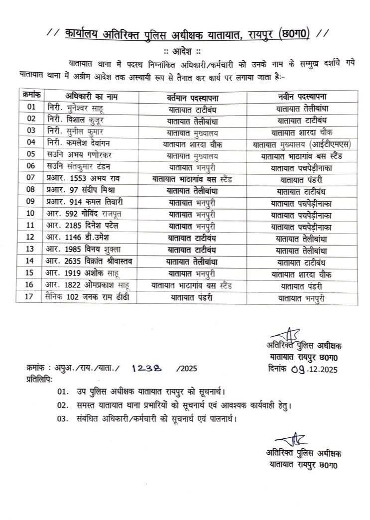 TI Transfer: : रायपुर : अतिरिक्त पुलिस अधीक्षक कार्यालय से जारी आदेश में शहर के कई यातायात थाना प्रभारियों, TI और अन्य पुलिसकर्मियों के तबादले किए गए हैं। आदेश के अनुसार यातायात टाटीबंध के थाना प्रभारी निरीक्षक भुनेश्वर साहू को तेलीबांधा स्थानांतरित किया गया है, वहीं निरीक्षक विशाल कुजुर को तेलीबांधा से टाटीबंध भेजा गया है।