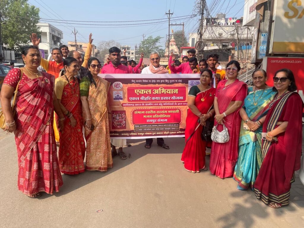 Van Bandhu Parishad Bhajan Competition : रायपुर (24 फरवरी 2026): वन बंधु परिषद द्वारा संचालित ‘एकल श्रीहरि कथा प्रसार योजना’ के तहत पिछले तीन महीनों से चल रही भजन-सत्संग प्रतियोगिता का भव्य समापन आज राजधानी रायपुर के फाफाडीह स्थित पाटीदार भवन में हुआ। इस संभाग स्तरीय फाइनल मुकाबले में सूरजपुर की टीम ने अपने उत्कृष्ट प्रदर्शन से प्रथम स्थान प्राप्त कर जीत का परचम लहराया।